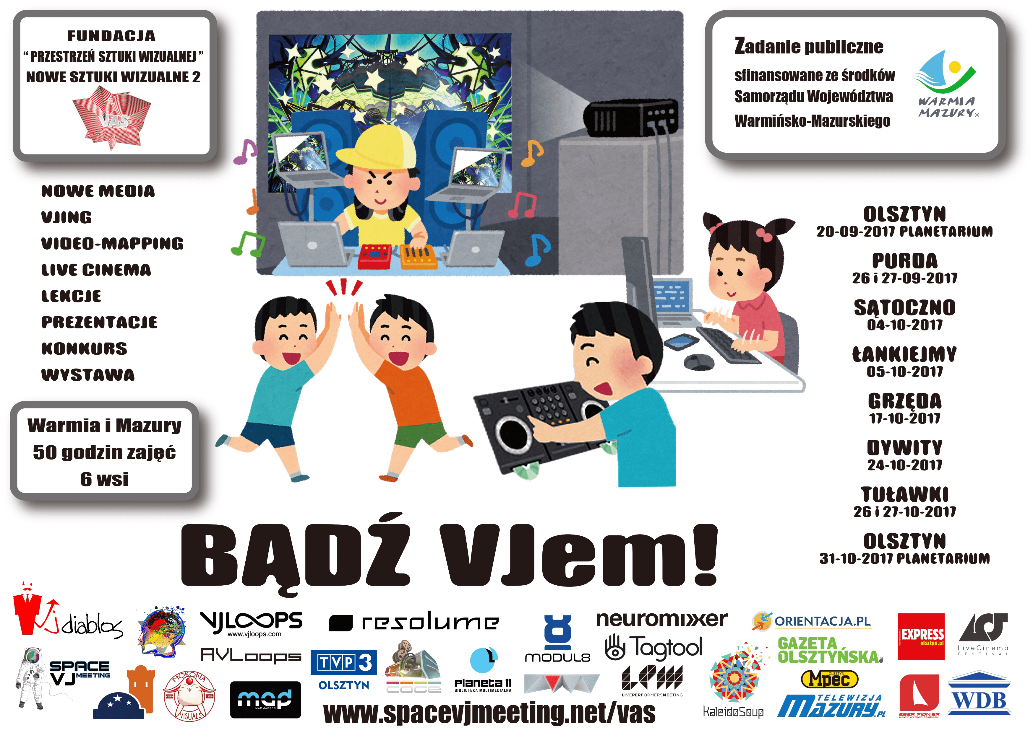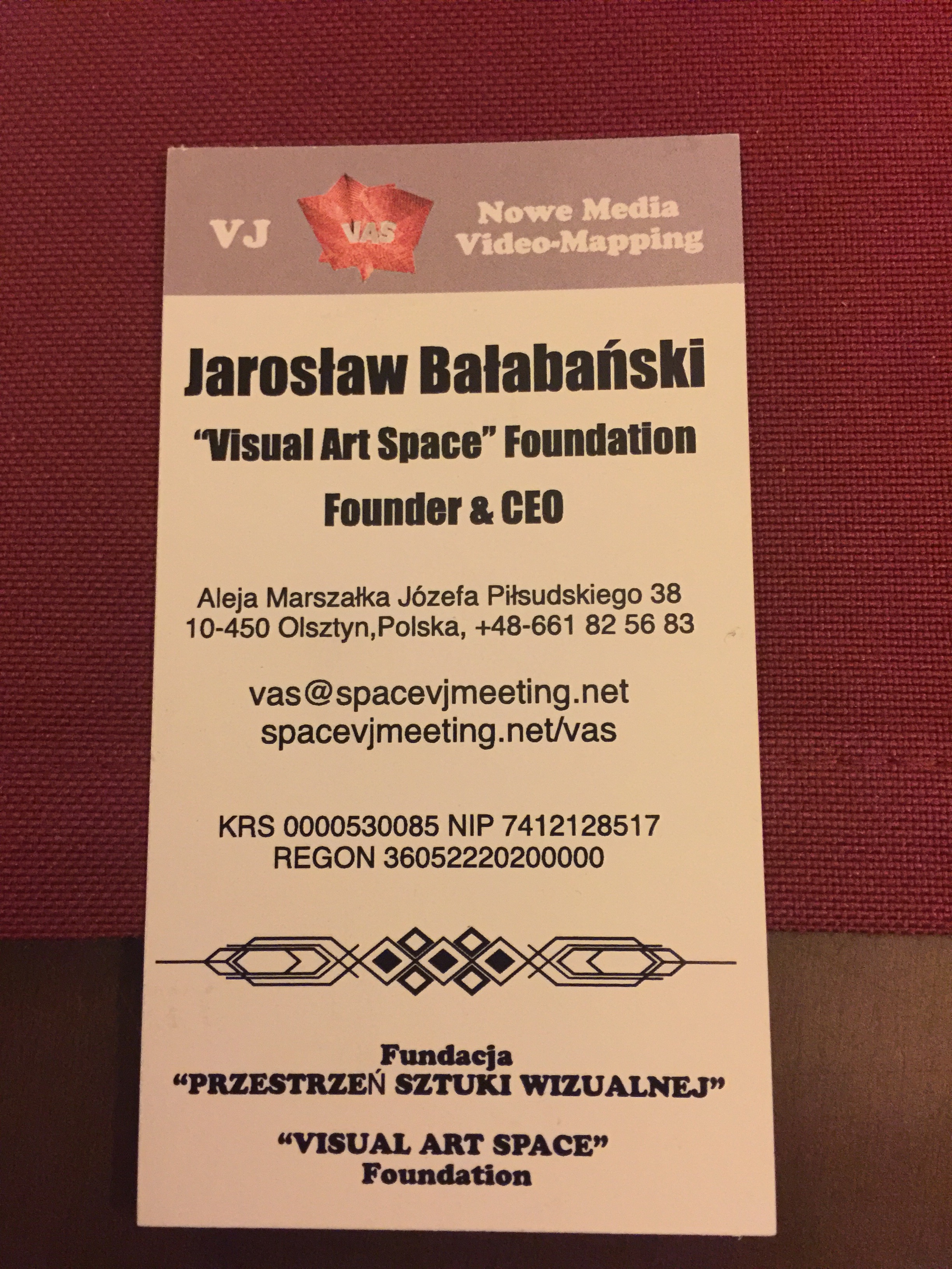 そもそもは、Space VJ Meetingの主催者であるJarosław Bałabański(以下、ヤロシュ)から、日本のVJコミュニティとの仲介役を依頼された事から始まりました。その時点でのヤロシュは「VJ文化を学校教育の現場に持ち込んで実績を重ねている偉大な篤志家」という認識だったので、私と志を同じくする者としてヤロシュからの協力要請に応じていました。いや、なにせわたくしなんでも一通り以上にこなしてしまう万能選手なものですから、具体的には名刺やら受講者募集チラシなど、彼の身の回りに必要なグラフィックデザインを都度提供するようになりました。時期的には2017年7月下旬辺りです。